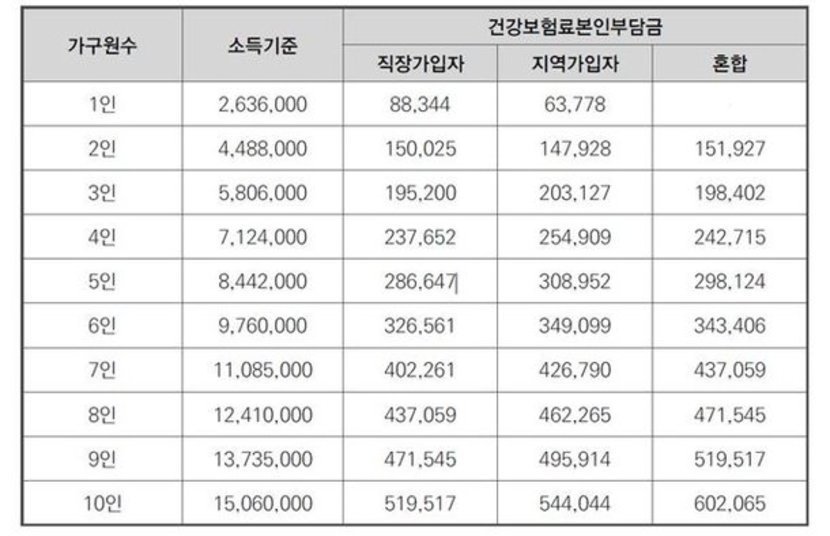소득판정기준표는 건강보험 지역가입자의 건보료 상한도 가구원 수 별로 제시한다. 지역가입자는 건보료가 6만3,778원(1인 가구)~25만4,909원(4인 가구)보다 적으면 중위소득 150% 이하로 본다.