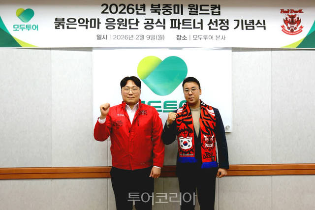 0 [투어코리아=조성란 기자] 모두투어가 2026년 북중미 글로벌 축구대회를 앞두고 대한민국 대표 응원단 ‘붉은악마’의 공식 파트너 여행사로 선정되며, 본격적인 글로벌 스포츠 테마 여행 시장 공략에 나섰다.모두투어는 지난 9일 서울 중구 본사에서 붉은악마 공식 파트너 선정 기념식을 열고, 원정 응원 상품 운영 방향과 공동 마케팅 전략을 공유했다고 10일 밝혔다.이날 행사에는 우준열 모두투어 사장과 이대혁 상품본부장을 비롯해 붉은악마 조호태 운영위원장, 김창섭 운영지원팀장 등이 참석해 협력 방안을 논의했다.