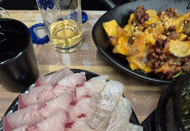 겨울에는 대방어를 안먹을 수 없죠.. 벌써 2번째 대방어🐟💙쫄깃한 식감이 넘 맛있어요~~ 깻잎에 백김치 싹 싸서 먹으면 굿😖💕맛돌이 조합추천 !! 매운탕 시키고 팔팔 끓고 있는 상태에회를 집어넣어서 익히고 먹으면 색다른 맛이 나요 🙂✨️오래 익히면 생선이고 살짝 하얗게 될 정도로 잠깐 익히면 더 맛있어요😆겨울엔 맛있는 게 많아서 좋습니당!!