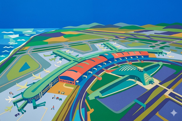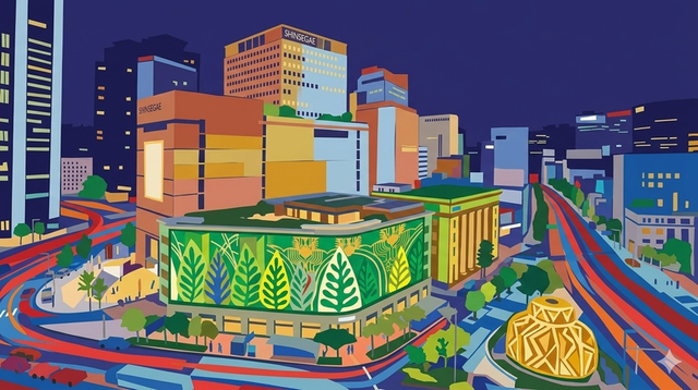 이 작품은 서울의 역동적인 도심인 명동의 밤풍경, 특히 신세계백화점 본점의 화려한 미디어 파사드를 앙리 마티스의 컷아웃(종이 오리기) 화풍으로 재해석한 그림입니다.환상적인 미디어 파사드의 재해석그림 중앙의 건물 벽면은 실제 크리스마스 시즌의 화려한 영상 대신, 마티스가 즐겨 사용했던 초록색 식물 잎사귀와 유기적인 문양들로 채워져 있습니다.강렬한 초록색과 노란색의 대비는 차가운 도심 건물에 따뜻한 생명력과 동화적인 분위기를 불어넣습니다.빛의 흐름을 담은 색면과 선도로 위 자동차들의 궤적은 정교한 빛의 묘사 대신 빨강, 주황, 파랑의 굵