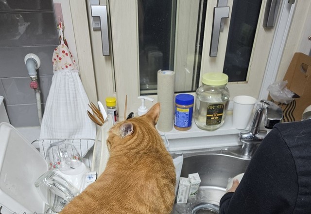방금 저녁에도 어머니가 설거지하는 걸 구경하는 노랑이