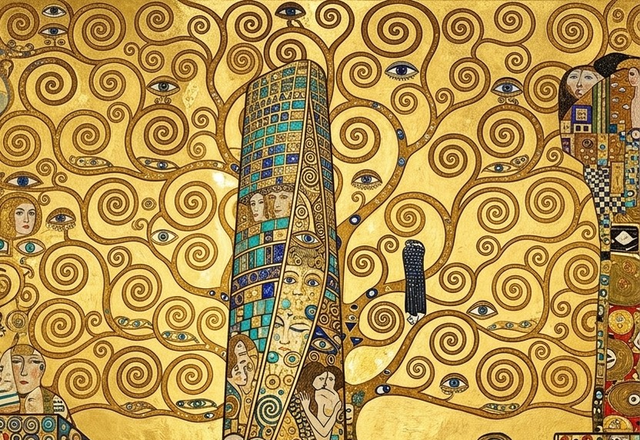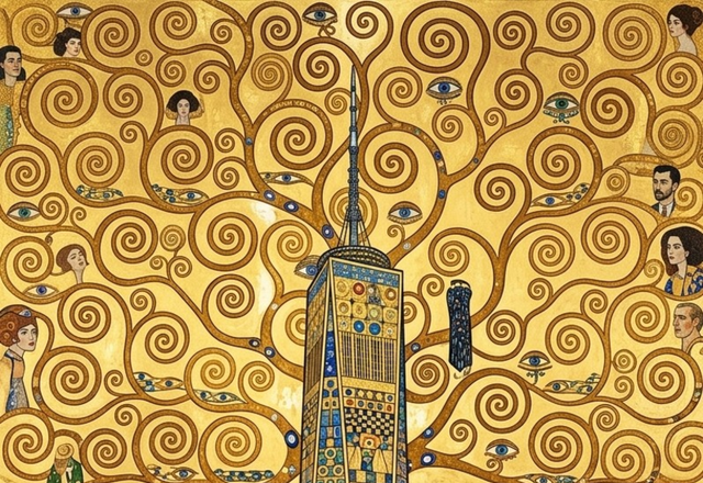 여기에 구스타프 클림트의 찬란한 황금빛 마법을 입고 완전히 새로운 모습으로 태어난 뉴욕의 '원 월드 트레이드 센터'가 있습니다. 이 그림은 차가운 강철과 유리의 빌딩을 찬란한 금박과 보석, 그리고 인간의 감정이 소용돌이치는 예술적 공간으로 뒤바꿔 놓았습니다.보석 모자이크로 빚은 마천루: 화면 중앙의 원 월드 트레이드 센터는 기하학적인 금색 타일과 푸른 보석 모자이크로 덮여 있습니다. 빌딩의 몸통을 감싸는 섬세한 금실 공예와 보석 장식은 그것이 가진 건축적 위엄뿐만 아니라 시각적인 광채를 뿜어내는 듯한 느낌을 줍니다.하늘을 뒤덮은 생명